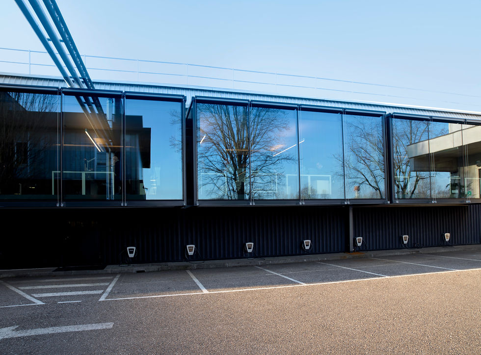 Sette strutture metalliche realizzate in carpenteria che offrono una comunicazione continua tra gli uffici direzionali e il settore produttivo.